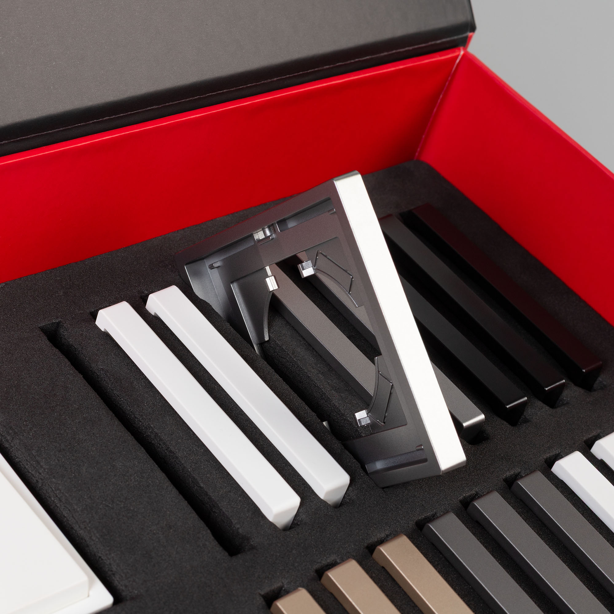 Демо-кейс с наполнением электроустановочных изделий серии TENDO. Демо-кейс содержит: Рамки серии TENDO в цветах белый, черный, золотой и серебристый (серый). Поверхность рамок имеет матовое и Soft-Touch покрытие; Механизм компьютерной розетки (двойной) в черном цвете - арт.054595 Механизм розетки с дополнительными USB Type A + Type A выходами в серебристом(сером) цвете - арт.054084 Механизм выключателя на две клавиши (проходной) в белом цвете - арт.054556. Механизм розетки под евровилку в золотом цвете - арт. 054081 Рамки представленной серии накладного типа монтажа - не требуют дополнительного оборудования для установки рамки на механизме.