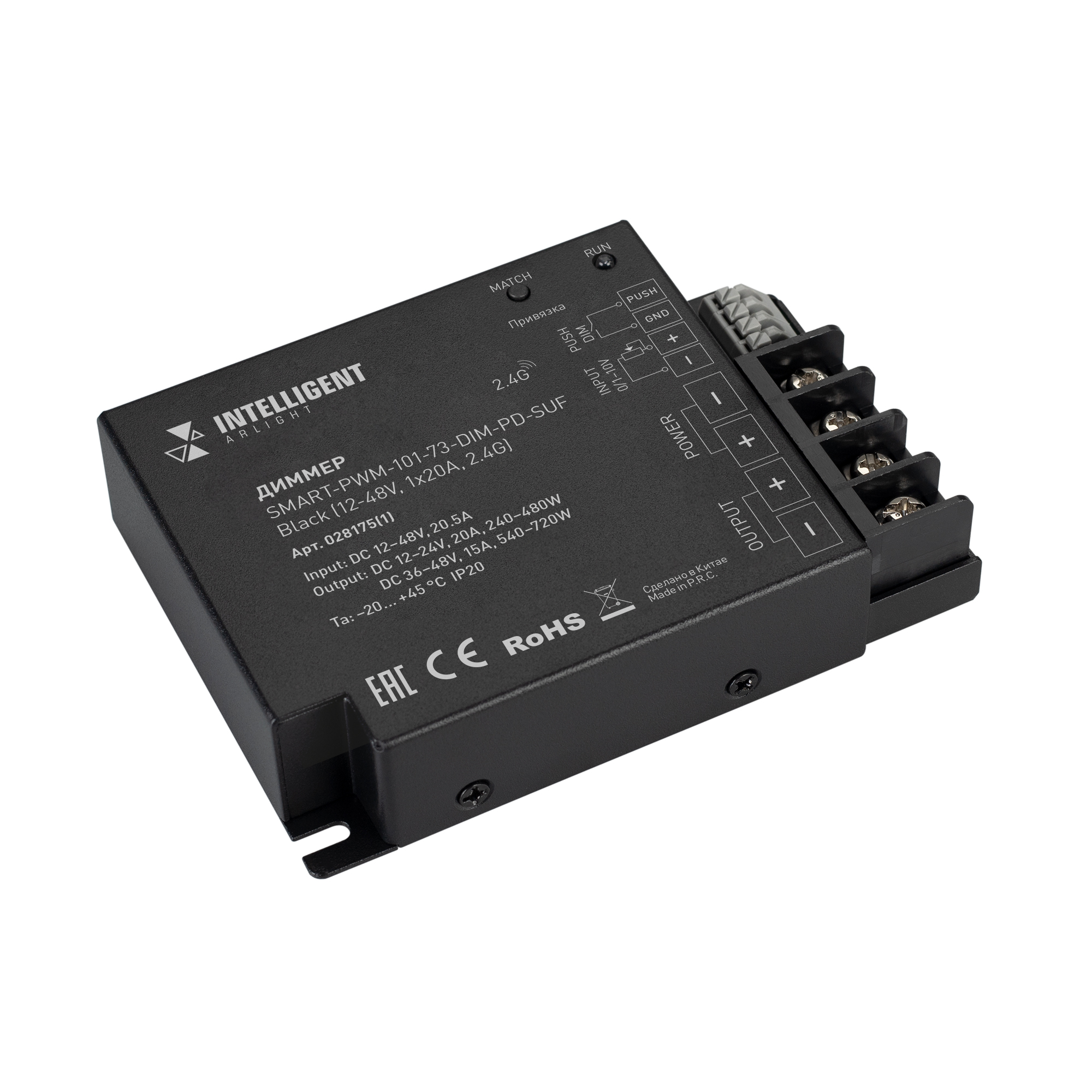 INTELLIGENT ARLIGHT Диммер SMART-PWM-101-73-DIM-PD-SUF Black (12-48V, 1x20A, 2.4G) (IARL, IP20 Металл, 5 лет) 028175(1) в Владимире