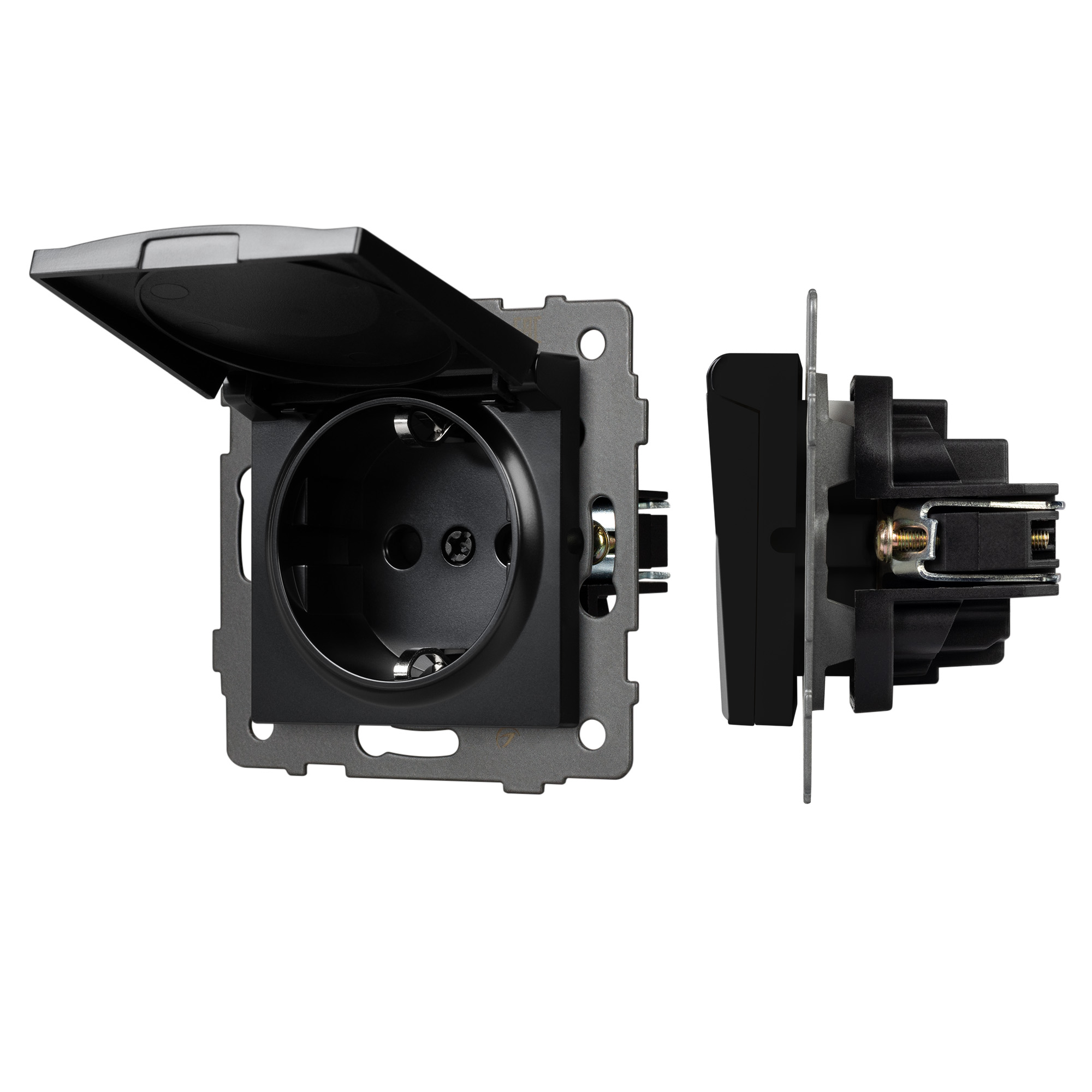 Механизм розетки с заземлением на 1 пост с влагозащитной крышкой. Цвет - черный. Без фронтальной рамки. Уровень пылевлагозащиты IP44. Устанавливается в стандартный подрозетник.