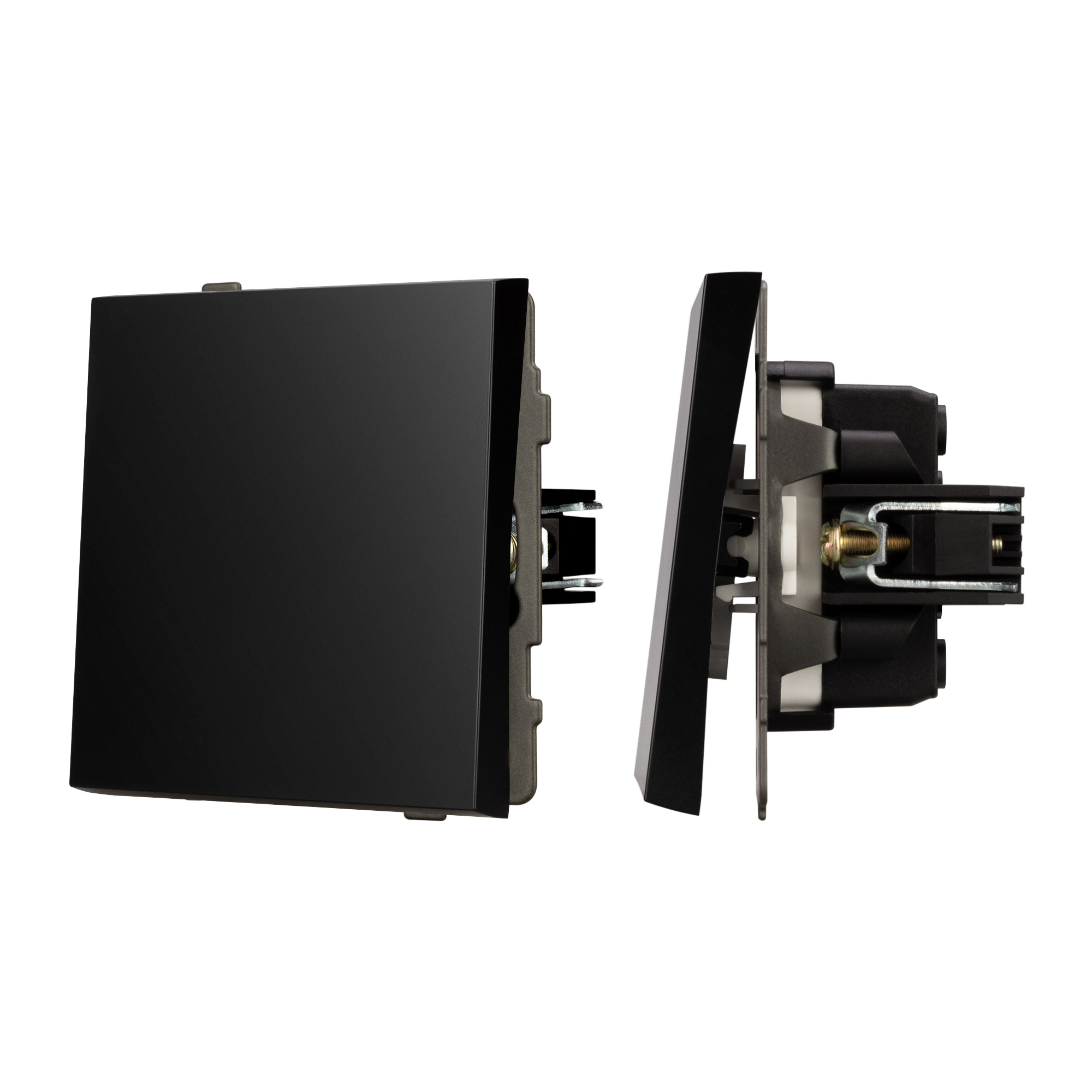 Механизм выключателя света совместим с рамками серии TENDO, создает утонченный минималистичный вид. Скрытый тип монтажа позволяет гармонично встроить в интерьер любого современного дизайн-проекта. Видимая часть механизма выполнена из высококачественного пластика черного цвета и имеет матовое покрытие. Контактная часть присоединяется при помощи винтовых зажимов, позволяя надежно подсоединить механизм выключателя к питающим элементам. А усиленные распорные лапки двойного захвата надежно фиксируют механизм в установочном подрозетнике круглого сечения диаметром 60мм. Суппорт окрашен порошковой краской и выполнен из металла толщиной 1,5мм, что обеспечивает безопасность и уверенность в установке. На каждой стороне суппорта размещены фиксирующие элементы, позволяющие комбинировать механизмы в системы до 5 шт как горизонтально, так и вертикально.