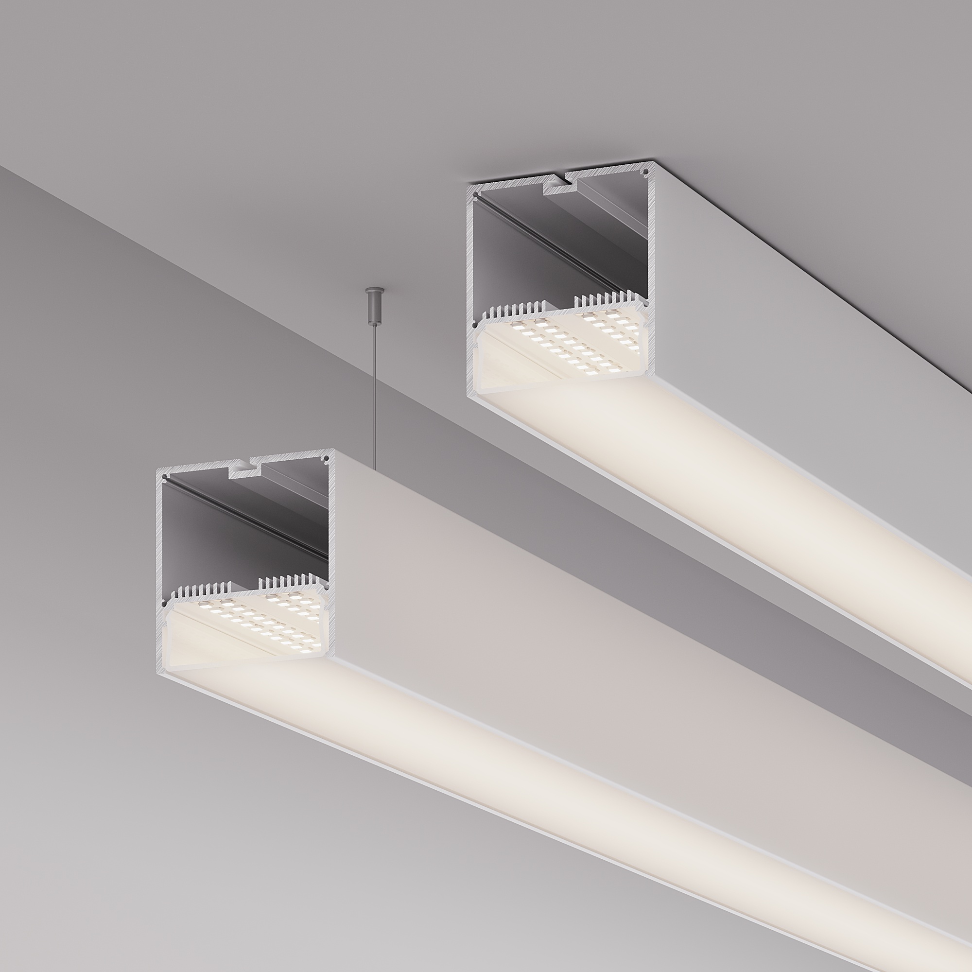 Подвесной/накладной профиль белого цвета из алюминия с отсеком для блока питания (70х40 мм) в комплекте с матовым рассеивателем из поликарбоната со светопропусканием 65% и заглушками идеально подходит для основного освещения и контурной подсветки. Габаритные размеры профиля составляют 2500 мм в длину, 74 мм в ширину и 77 мм в высоту. Площадка для установки светодиодных лент позволяет использовать ленту шириной до 60 мм и мощностью до 79,2 Вт/м. Это обеспечивает гибкость в выборе светодиодных лент и создает потрясающие световые решения. Монтаж осуществляется накладным либо подвесным способом. Для накладного монтажа на держатель 019911 на 1 метр профиля рекомендуем использовать не менее 5-ти держателей. Прочие аксессуары не включены в комплект и приобретаются отдельно. Цена указана за комплект. Отличное решение для создания современных световых проектов.