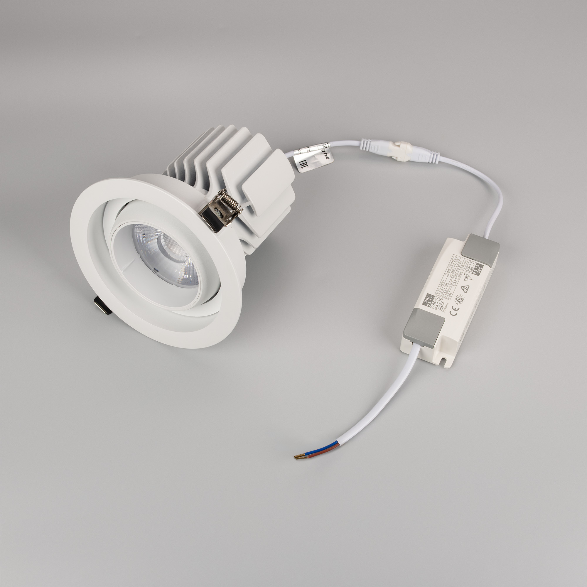 Встраиваемый карданный поворотный светильник с высоким индексом цветопередачи CRI>92 предназначен для создания качественного освещения. За основу поворотного механизма светильника взят принцип кардана – подвижное соединение двух колец, вложенных одно в другое. Световой модуль вращается вокруг своей оси на 360 градусов и отклоняется от горизонта на 30 градусов, что позволяет с лёгкостью регулировать направление пучка света и его концентрацию на определенной зоне. Особая конфигурация корпуса из алюминия оригинально смотрится в интерьере и позволяет эффективно отводить тепло. Светильник с углом рассеивания 17 градусов отлично подходит как для локальной акцентной подсветки витрин, прилавков магазинов, бутиков и стендов выставочных залов. Легко устанавливается с помощью пружин в монтажное отверстие потолка. В комплекте поставляется драйвер, что позволяет безопасно и быстро подключать светильник напрямую к сети переменного тока 230 В.