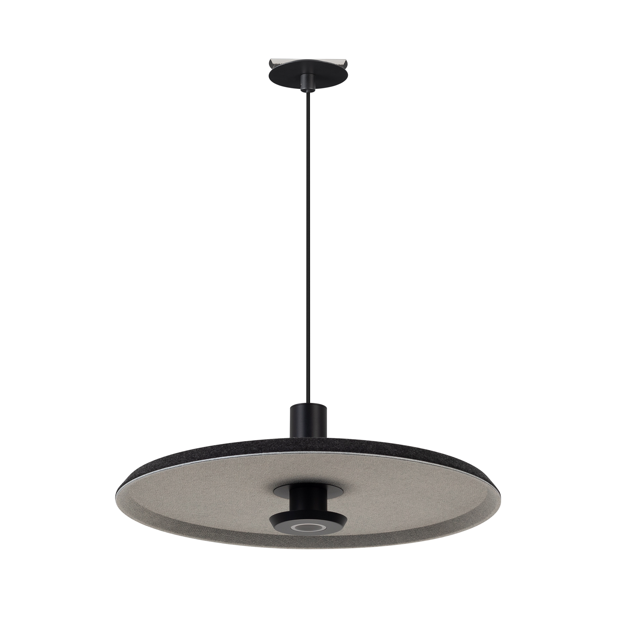 Подвесной светильник. Мощность 12 Вт, св. поток 648 лм, 64 лм/Вт, теплый 2700 K, CRI>94, угол 36°, напряжение питания 230 В. Темно-серый фигурный плафон из переработанного фетра со светло-серой внутренней поверхностью, линза-рассеиватель из PMMA, степень защиты IP20. Размер: диаметр 450 мм, высота 145 мм. Монтаж подвесной, длина подвеса 2000 мм, регулируемая. В комплекте 2 вида чаш. Габариты чаши (встраиваемая) Ø80 х 23 мм, врезное отверстие Ø60 мм. Габариты чаши (накладная) Ø120 x 35 мм. Драйвер 59В, 300 мА, пульсация <1%. Управление по TRIAC.