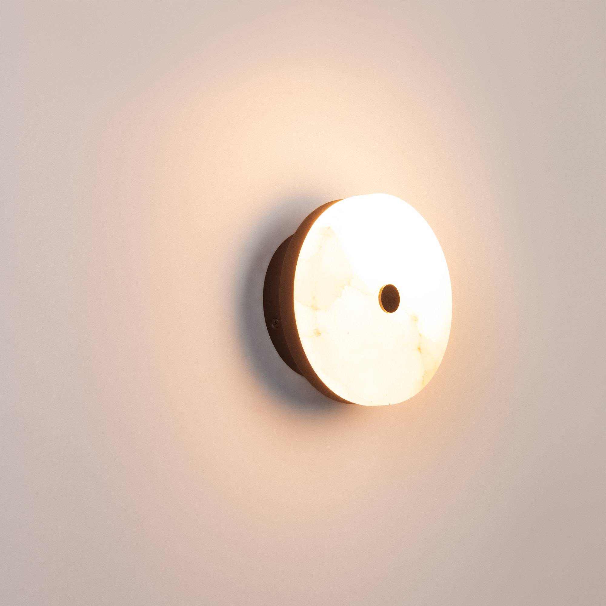Настенный светильник. Мощность 12 Вт, св. поток 172 лм, 15 лм/Вт, теплый 2700 K, CRI>92, угол 130°, напряжение питания 230 В. Черный круглый корпус из алюминия, рассеиватель из мрамора, степень защиты IP20. Общие габариты светильника: Ø164 х 80 мм. Габариты основания: Ø120 х 40 мм. Монтаж накладной. Драйвер 30-42 В, 300 мА, пульсация <1%.